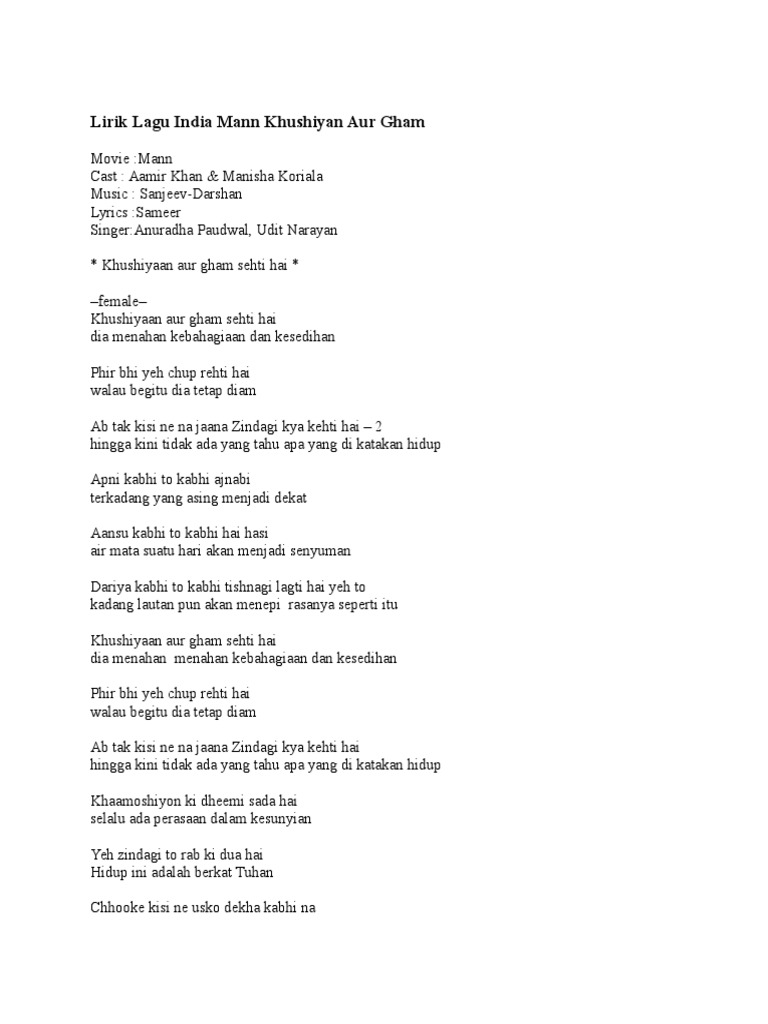 Khushiyaan aur gham sehti hai female Khushiyaan aur gham sehti hai dia menahan kebahagiaan dan kesedihan Phir bhi yeh chup rehti hai walau begitu dia tetap diam Ab tak kisi ne na jaana Zindagi kya kehti hai 2 hingga kini tidak ada yang tahu apa yang di katakan hidup Apni kabhi to kabhi ajnabi terkadang yang asing menjadi dekat. Chords for Khushiyan Aur Gham. Kabhi khushi kabhie gham c na judaa honge hum am dm kabhi khushi kabhie gham song name kabhi khushi kabhie gham movie kabhi khushi kabhie gham singer lata mangeshkar composer jatin lalit lyricists sameer anjaan director karan johar producer yash johar studio dharma productions pvt.